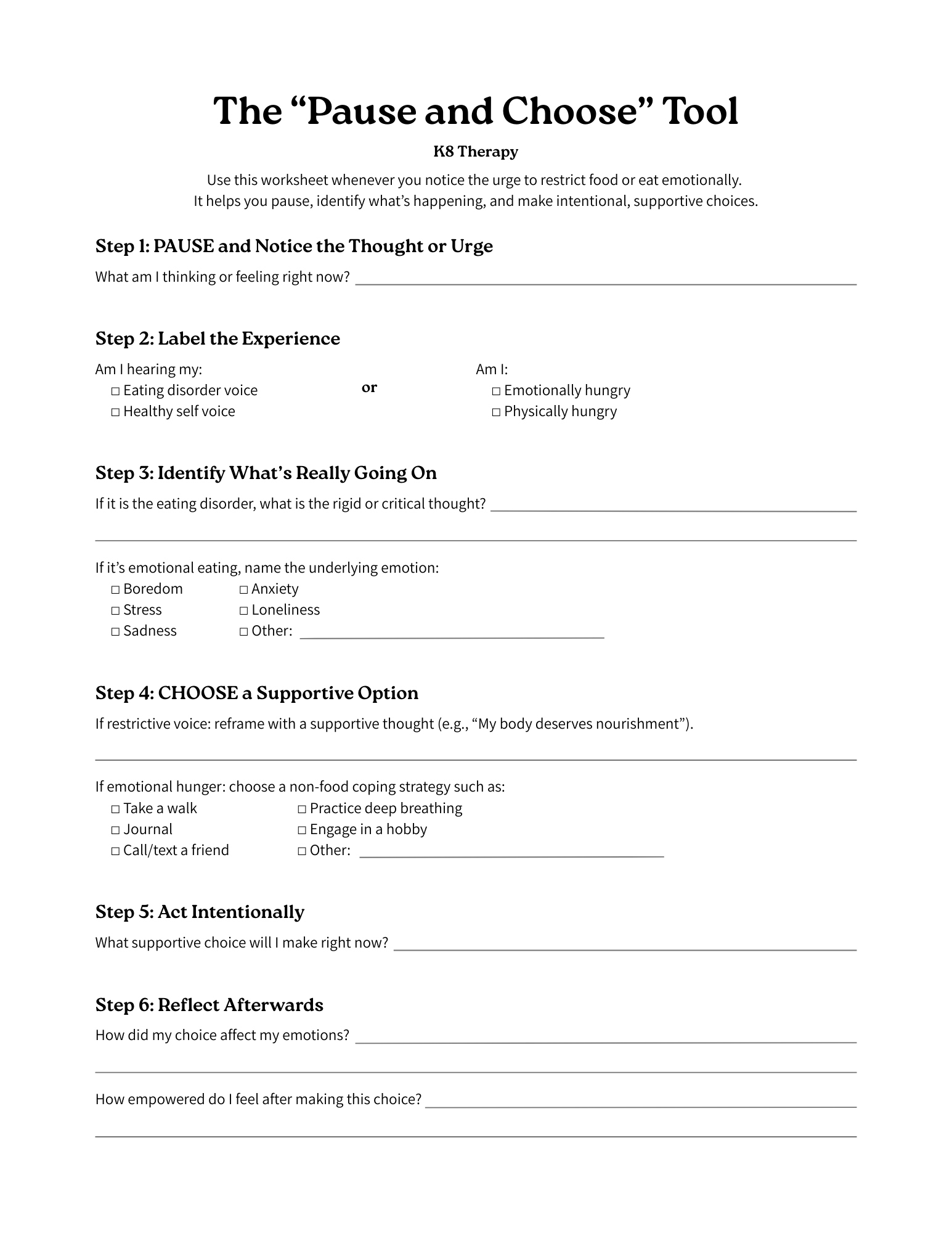 Ready to start practicing the power of choice in your own life? Download the “Pause and Choose” worksheet to help you challenge restrictive thoughts, manage emotional eating, and make empowered decisions every day.